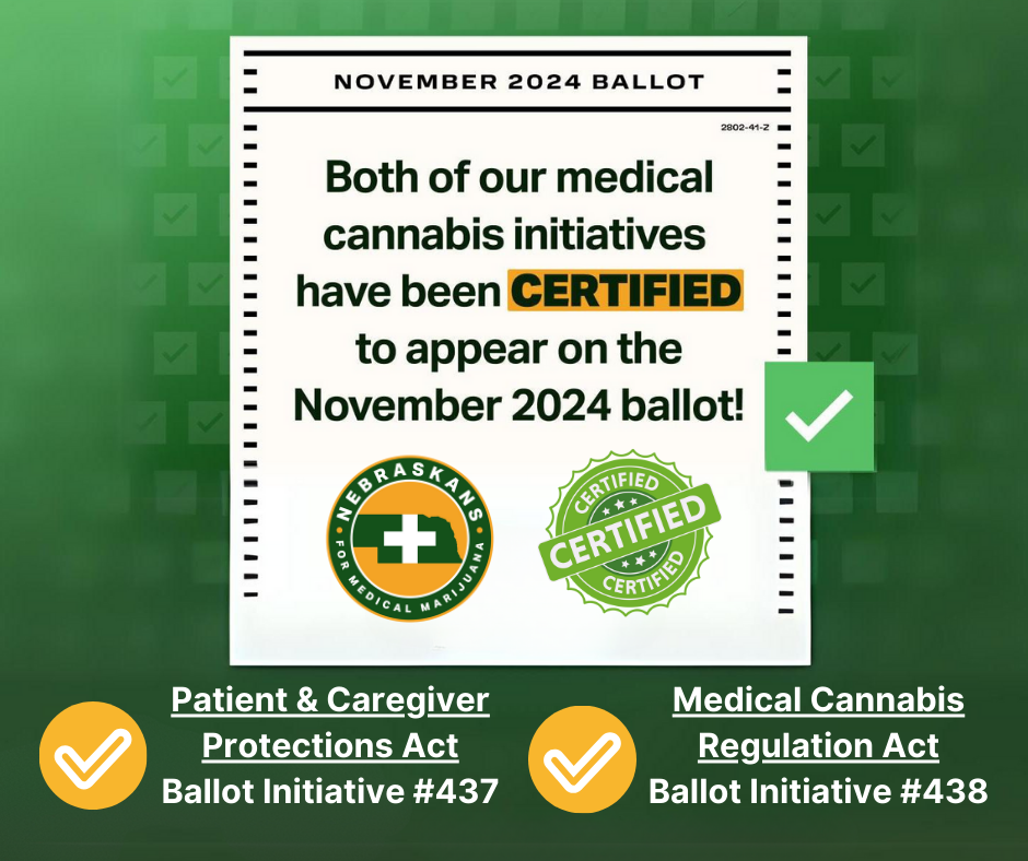 “Today we celebrate, along with Nebraska patients and caregivers, in this significant milestone of ballot certification. Many years of hard work, along with Nebraska’s unwavering and overwhelming support, has made this day possible. We are confident that come November, Nebraskans will once and for all have the ability to vote FOR safe and compassionate medical cannabis access and regulation.”